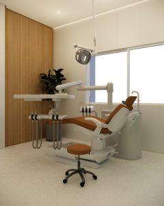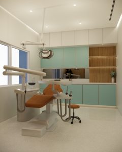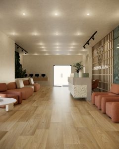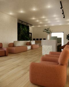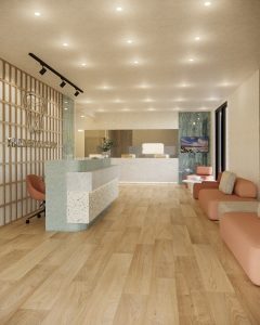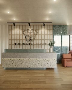 This dental clinic design reimagines healthcare spaces with a soothing and elegant approach. A soft, neutral palette of warm wood tones, pastel seating, and natural stone textures creates a calming environment for patients. The reception area features a sleek, modern desk with terrazzo and glass accents, offering a welcoming first impression. Carefully curated lighting enhances the ambiance, while subtle design details, such as the wooden grid wall and green stone feature, add depth and sophistication. Merging functionality with aesthetics, this space ensures a serene and comforting experience.