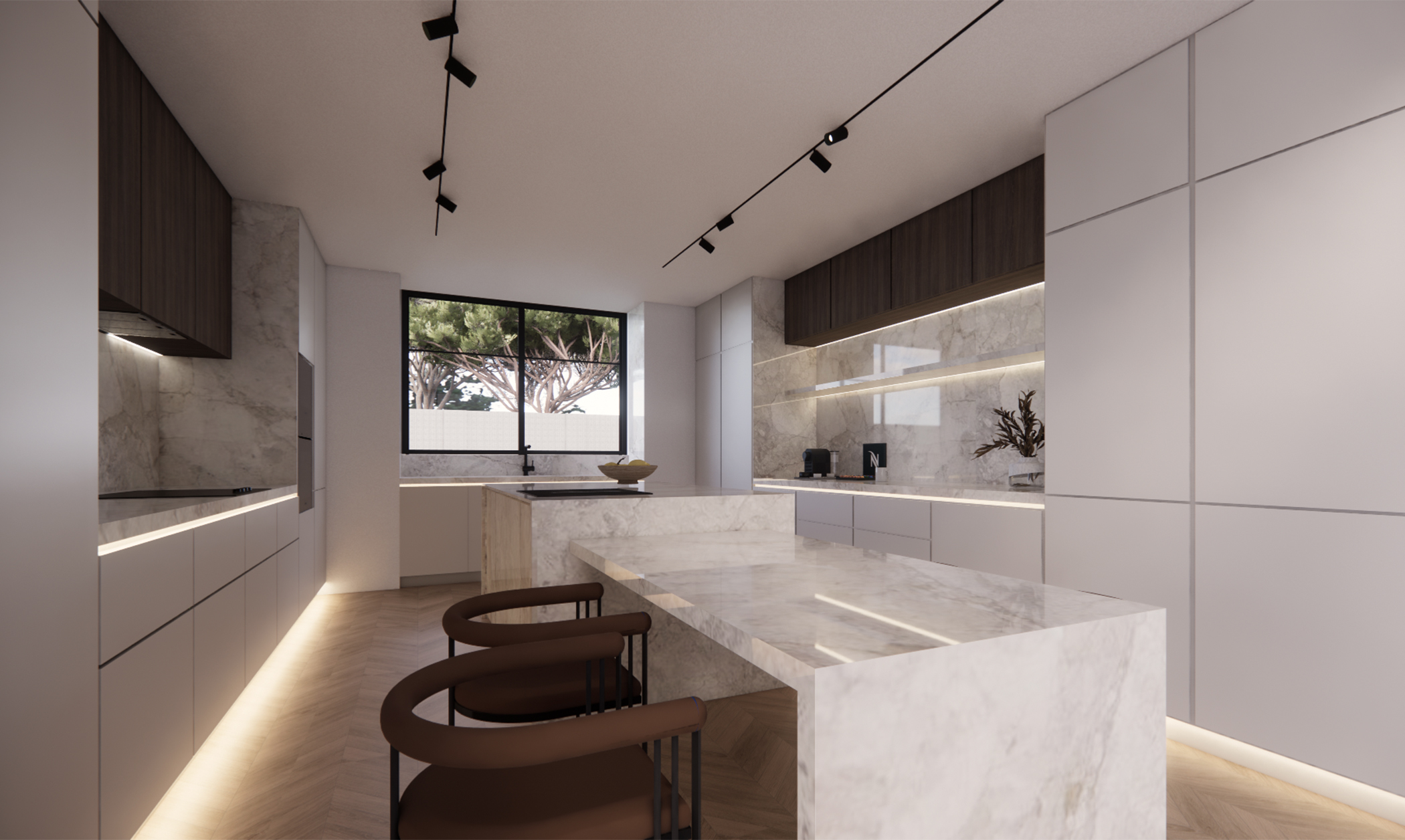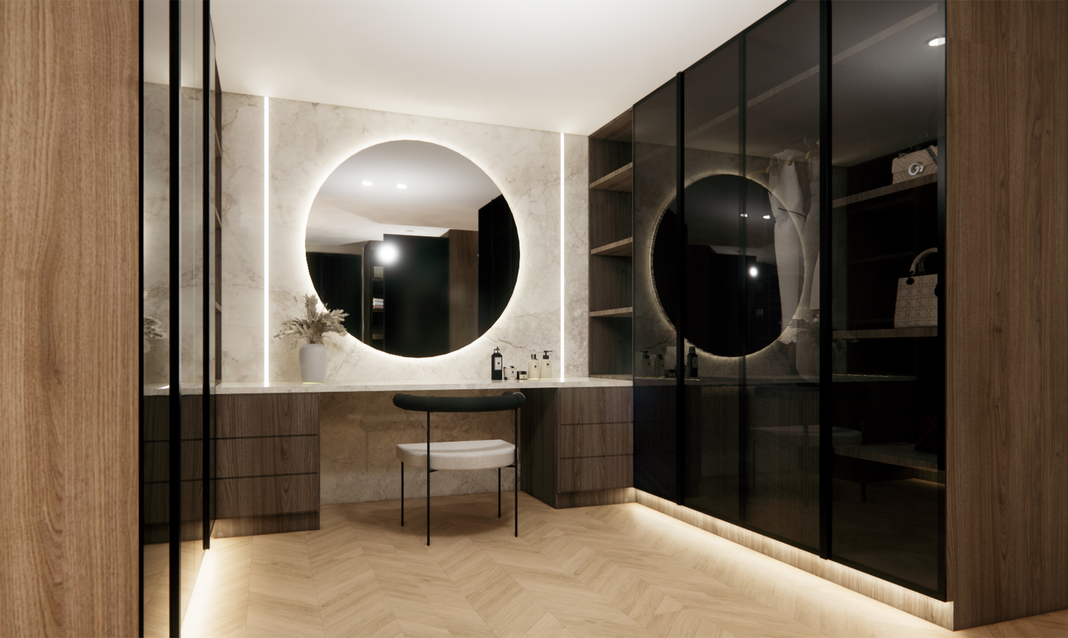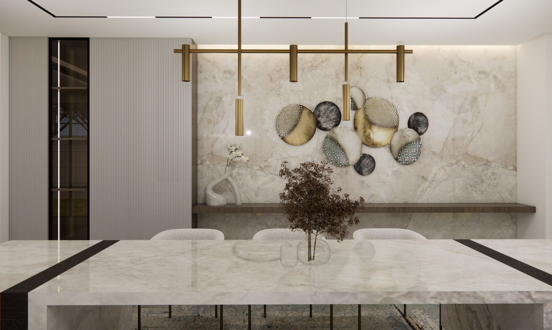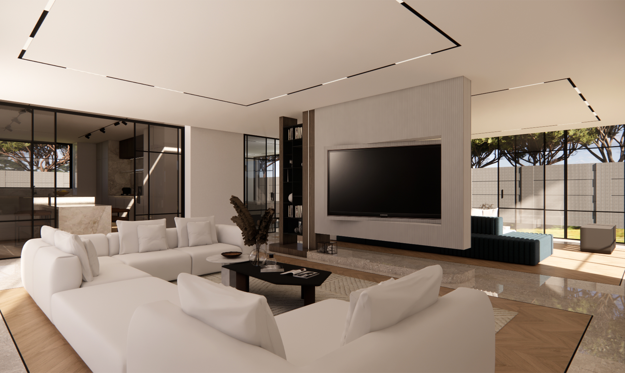 A modern living space redefined – this design concept for a villa in Jumeirah Golf Estates embodies sophistication and functionality. The rotating TV unit allows for a dynamic and versatile layout, seamlessly connecting the space. A modern clad ceiling with sleek linear track lights enhances the ambiance, while the minimalist design keeps the aesthetic clean and timeless. The combination of wood and porcelain stone flooring adds warmth and texture, striking the perfect balance between luxury and comfort. A space designed for effortless elegance and contemporary living.