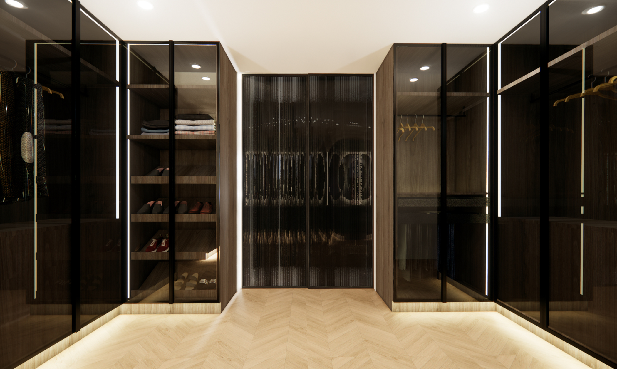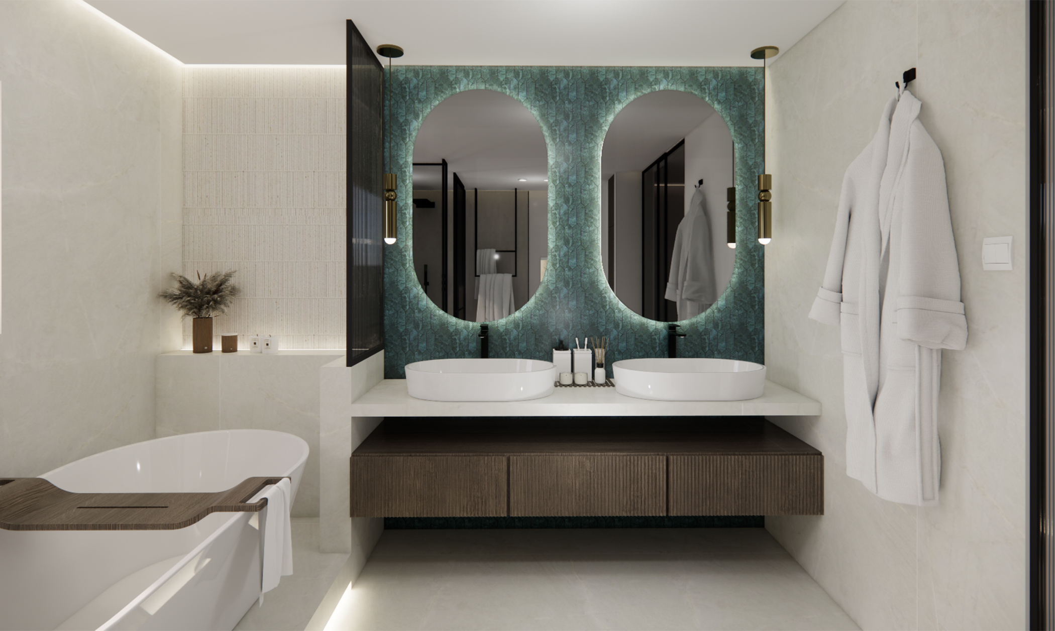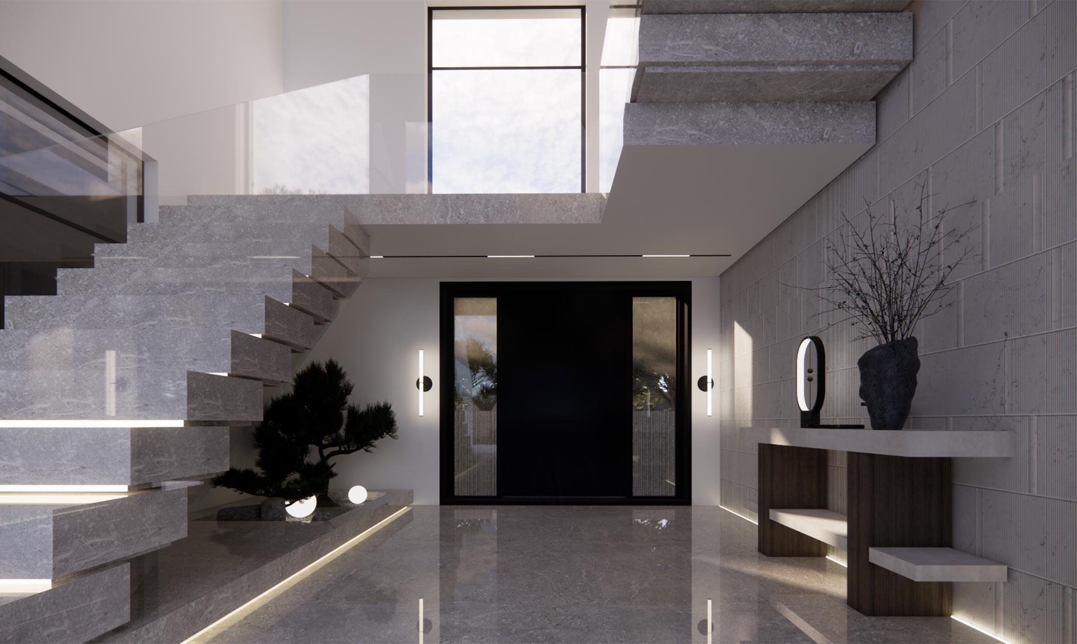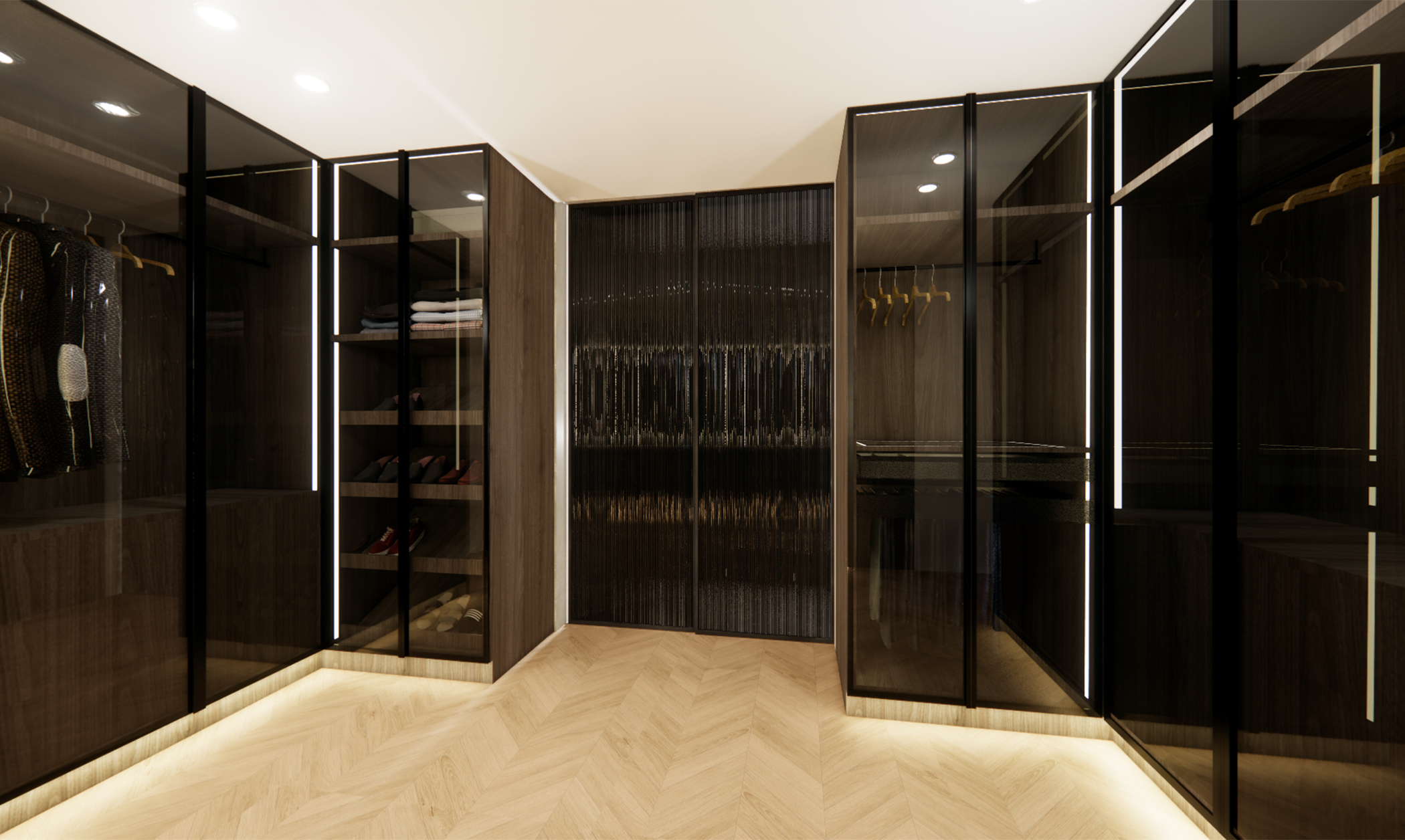 A modern living space redefined – this design concept for a villa in Jumeirah Golf Estates embodies sophistication and functionality. The rotating TV unit allows for a dynamic and versatile layout, seamlessly connecting the space. A modern clad ceiling with sleek linear track lights enhances the ambiance, while the minimalist design keeps the aesthetic clean and timeless. The combination of wood and porcelain stone flooring adds warmth and texture, striking the perfect balance between luxury and comfort. A space designed for effortless elegance and contemporary living.